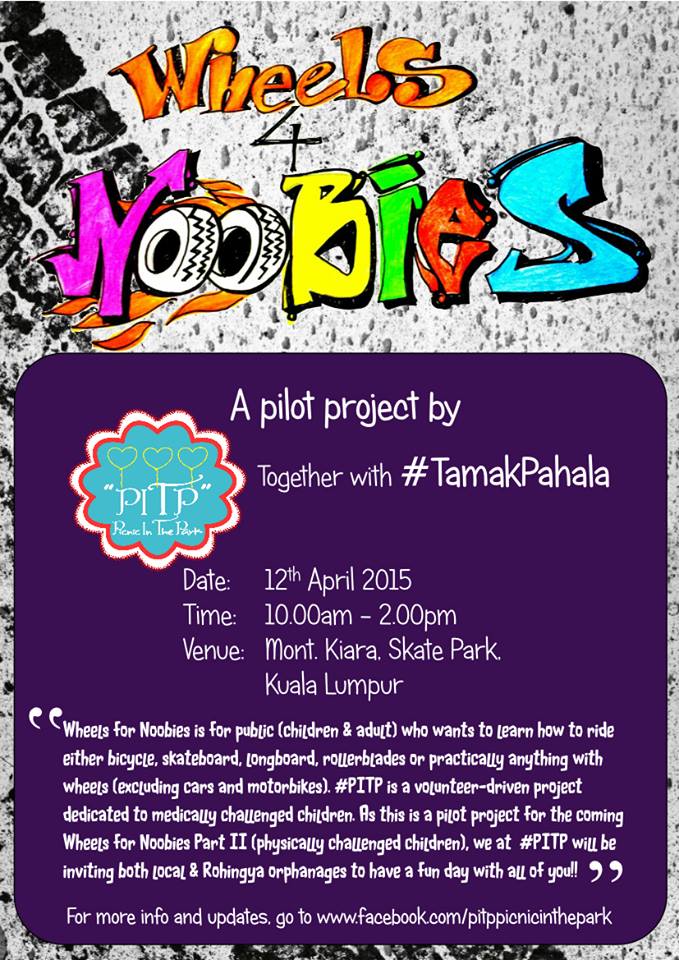 Wheels for Noobies is for those who never got around to learn what it is like to ride bicycles, skateboards, roller blades or anything on wheels (cars don’t count guys!) Their aim is to create a fun environment where us newbies get to learn at our own pace, surrounded by people who are just like us! There will be a lot of wheels around on that day, and being Malaysians, a lot of food too 😉