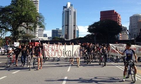 The action began smoothly with no disturbance. The cyclists moved from Dataran Merdeka to Jalan Raja Laut, where two banners was hung by some of the cyclists. A group of plain clothed officers approached the group, and asked the group to remove the banner. This quickly escalated into a scuffle, and one of the person who was holding the banner, Bani was detained in the process by at least four plain clothed officers. He was handcuffed, and the handcuff was so tight that his wrists were bleeding. He was also slapped by an officer in the DBKL van on the way to the police station.