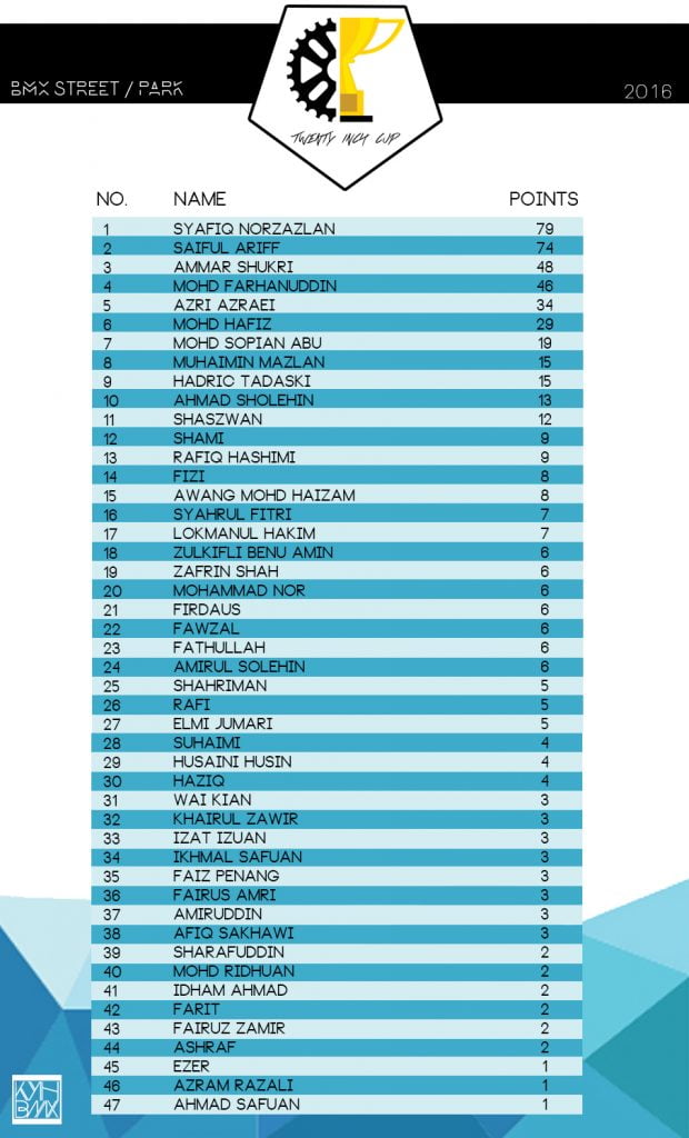 TIC Final Ranking Post author:iwan Post published:April 21, 2017 Post category:News Post comments:0 Comments Here is the final ranking after the BMX Street / Park section A and B , and also for BMX Flatland competition at Twenty Inch Cup Grand Finale last weekend at Mont Kiara Skatepark. Tags: bmx malaysia, bmx ranking, kayuhbmx, twenty inch cup Read more articles Previous PostTwenty Inch Cup Grand Finale 2016 Season full result Next PostTwenty Inch Season Grand Finale 2016 Season Video Highlight You Might Also Like Twenty Inch Cup Grand Finale 2018 Season April 23, 2019 Healthy One SSM BMX Street & Flatland Result December 4, 2016 BMX Freestyle Malaysia National Championship Result and Photos July 5, 2023 Leave a Reply Cancel replyCommentEnter your name or username to comment Enter your email address to comment Enter your website URL (optional) Save my name, email, and website in this browser for the next time I comment.