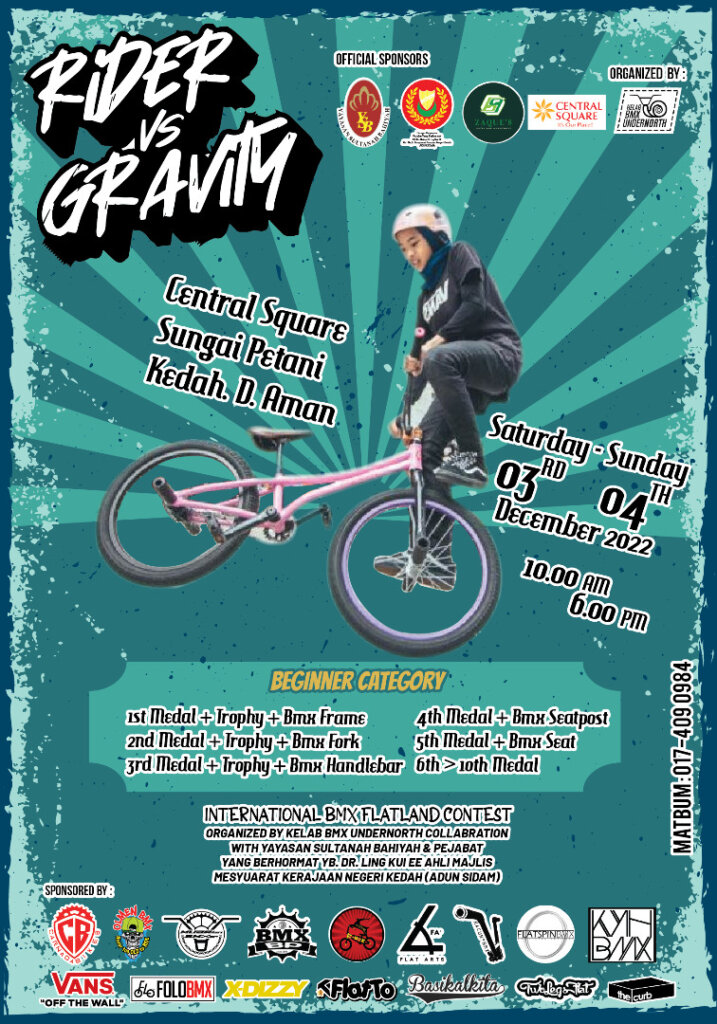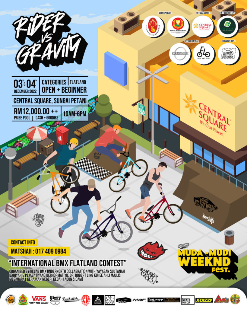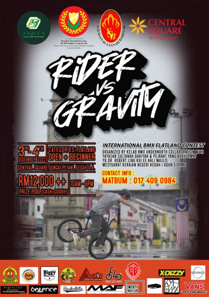 Rider vs Gravity International Bmx Flatland Contest this coming next month on 3rd-4th December 2022. This contest collabration with Yayasan Sultanah Bahiyah & Pejabat Yang Berhormat YB Dr.Robert Ling Kui Ee ,Ahli Majlis Undangan Negeri Kedah 7(ADUN Sidam).